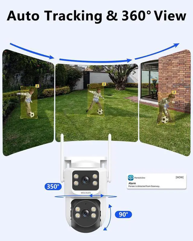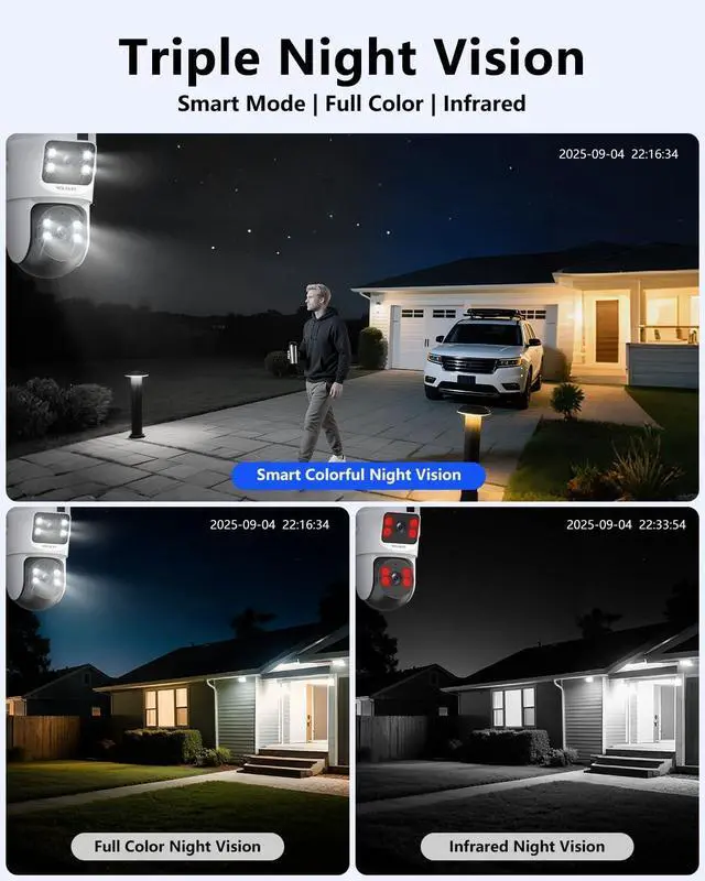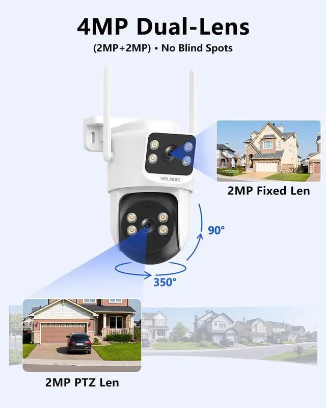 PTZ Control & Color Night VisionWith a 350° horizontal and 90° vertical range, these outdoor home security cameras eliminate blind spots. The wireless PTZ control lets you monitor your entire property from your phone. They support infrared night vision and full-color white light mode providing clear full-color images day and night.