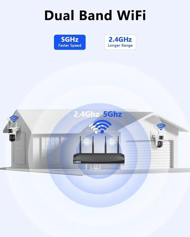 Dual-Band WiFiEnjoy smooth live streaming and playback with an outdoor home security camera system powered by dual-band 2.4 GHz and 5 GHz WiFi. This system resists interference from other devices ensuring stable video even on busy home networks.