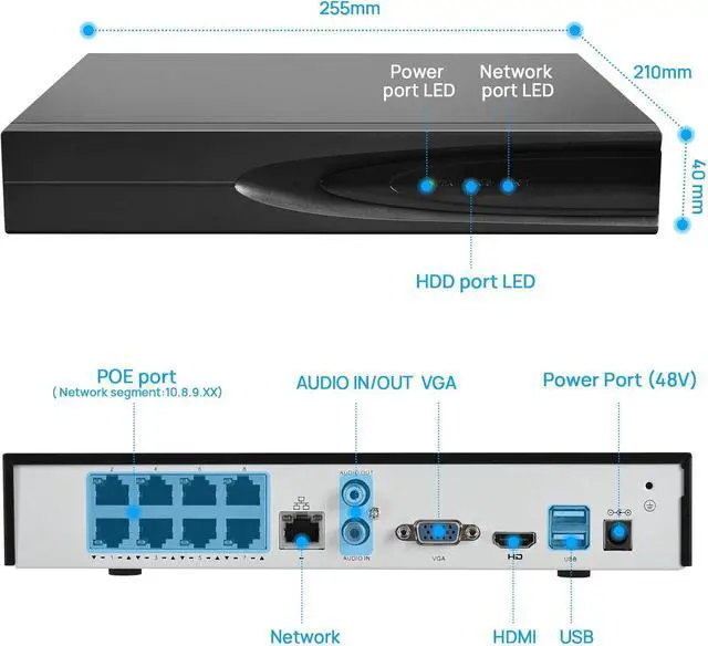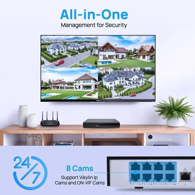 8 Channel NVR and 4K Ultra HD ResolutionThis 8 channel VIKYLIN NVR Network Video Recorder supports recording, Playback & Live View in Up to 8MP/4K Resolution. Support 8MP/6MP/5MP/4MP/3MP/1080P IP PoE Camera. Note: this 4K NVR supports 4K TV or monitor HDMI or VGA interface connection output.