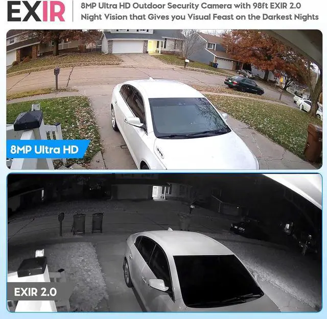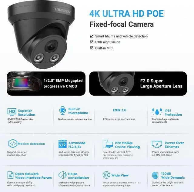 ULTRAHD 4K 8MP RESOLUTION3840x2160 8-Megapixel @20fps,6MP@30fps resolution featuring enhanced low illumination utilizing the latest CMOS1/2.8" Progressive Scan CMOS,98ft IR night vision,EXIR have Better image quality in darkness. 2.8mm fixed lens provide 115°viewing angle,the 4k poe camera can capture more available light, and display more clear image details,always keep your safty