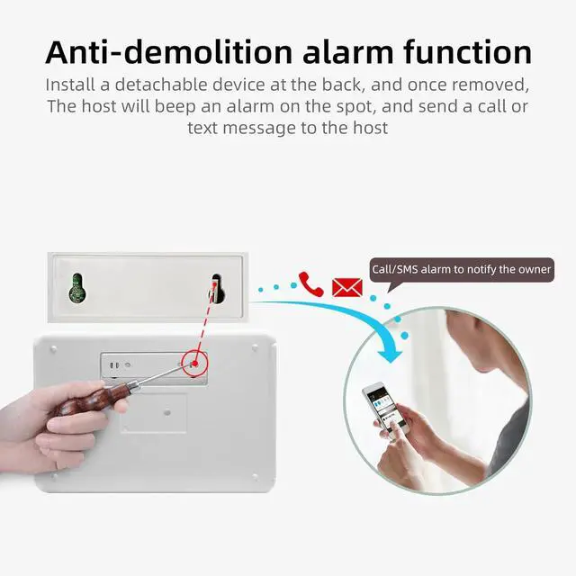 Support Wireless Alarm System NetworkThe central panel has a built-in 4G GSM module. You can set 5 groups of telephone alarm numbers and two groups of SMS alarm numbers. When the alarm sounds, the control panel makes a call and sends an SMS to the previously set telephone number. You can also use cell phones (or landlines) to dial the control panel number or send an SMS to the control panel number