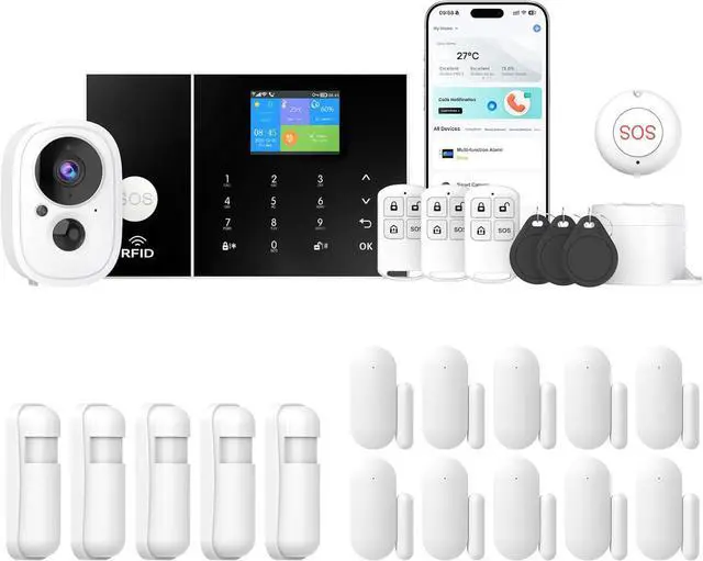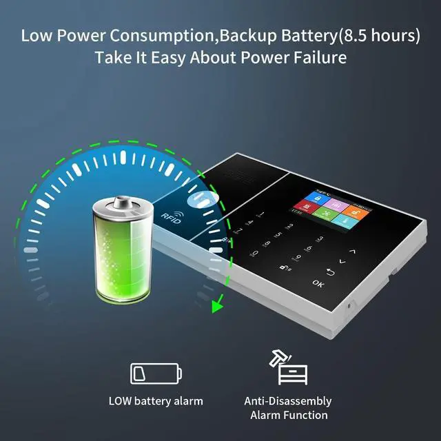 WiFi +4G: Home alarm support Wi-Fi APP push network alarm, SMS, voice monitoring, main network and other multi-channel alarm methods to ensure stable and reliable alarm performance. Up to 100 controllers, RFID cards and wireless detectors learn the storage location.