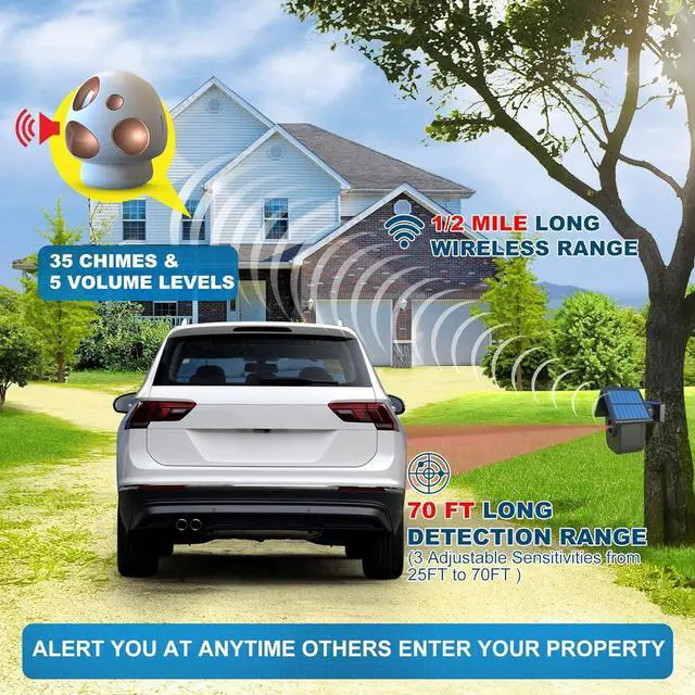 70-Ft Long Motion Detection Range - The solar motion detector will detect moving people or vehicles from 25 feet to 70 feet in front of it. It has 3 adjustable sensitivities( Low=25ft; Medium=50ft; High=70ft), ideal for driveways, walking paths,yard,garage,gate,pool and anywhere of your outdoor properties you want to be alerted.