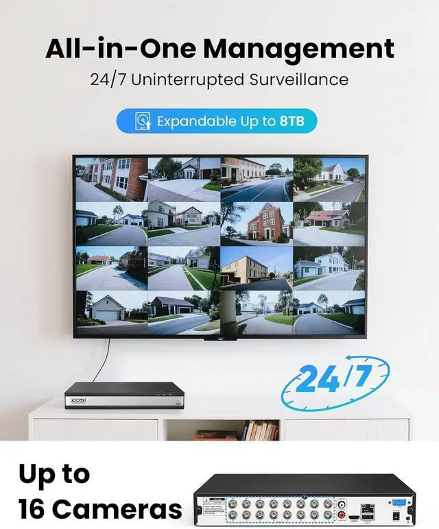 (5). [ Advanced H.265+ High Video Compression ] __ ZOSI self-developed H.265+ video coding technology optimizes storage by focusing on surveillance scene characteristics, offering better image quality and saving about 80% storage compared to H.264. Please note: This DVR is not compatible with IPC or POE cameras, nor does it support analog cameras above 5MP. Additionally, all cameras connected to this DVR must be wired, not wireless. The DVR does not support data storage for our IPC products.