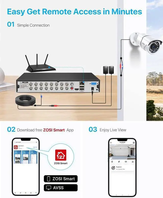 (3). [ Local or Remote Access Anytime & Anywhere ] __ View and control your security system locally by connecting the system to a monitor, or via free ZOSI Client software on Windows or Mac, or via iOS & Android APP (ZOSI Smart ) on mobile devices remotely.
