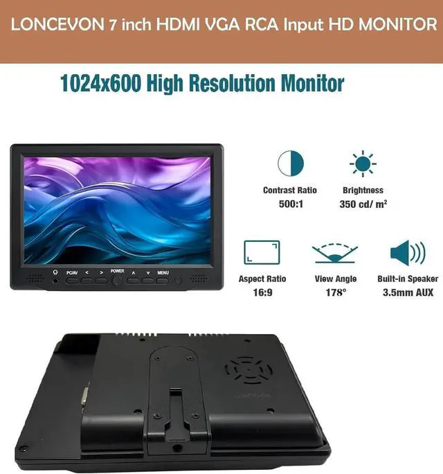 Main Features A: 7 inch LCD HDMI VGA small monitor with IPS 1024*600 screen resolution, takes 1080p image with 178 degree off-axis viewing; 500 nits brightness, 16:9 aspect, 60 HZ refresh rate ;Contrast Ratio 500:1;30 millisecond response time ;This small monitor has a full size HDMI port and a classic 15 pin VGA d-sub port for video input .Audio output comes from either built-in speakers or a 3.5mm headphone jack;