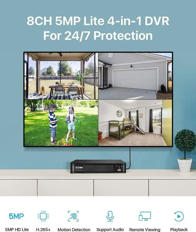 (2). [ 4-in-1 5MP Lite Security DVR ] __ Hybrid Capability 4-in-1 8 Channel 5MP Lite Full 1080p DVR Recorder, with self-adaptive technology, it supports 4 kinds of camera models: 960H Analog,720P/1080P AHD,720P/1080P/12.5fps 5MP TVI and CVI. Note: This DVR (No Hard Drive Included) is recommended to be used in conjunction with ZOSI cameras for a better user experience. If you need record or playback, you need to install an internal hard drive or buy our DVR come with a built-in hard drive.