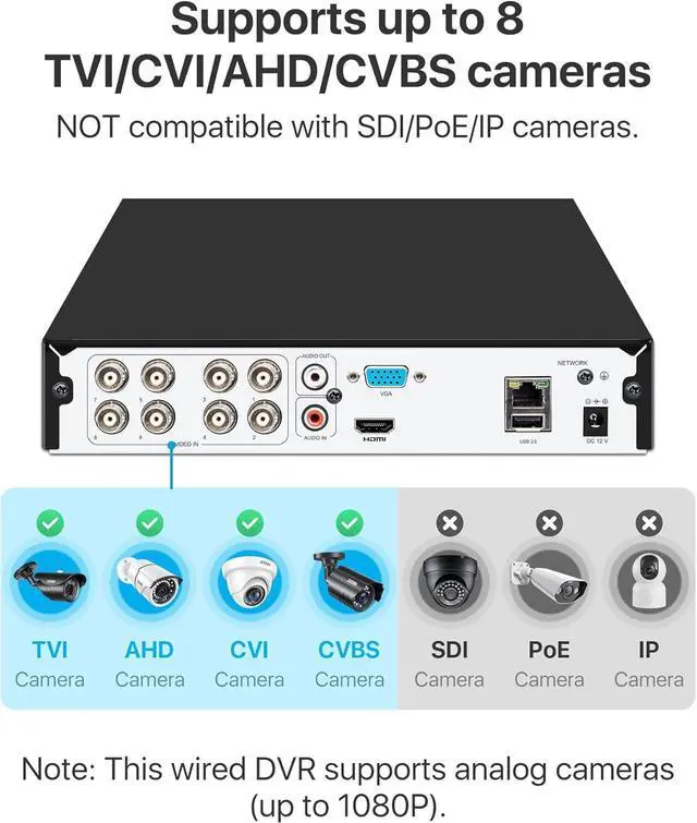 8CH 1080P DVR recorder: This 8CH 1080P 4-in-1 wired DVR is designed for professional-grade surveillance, offering support for analog, HD-TVI, CVI, and AHD cameras. With its 8 channels, it allows you to connect up to 8pcs 720P or 1080P CCTV cameras(support up 1080p), providing comprehensive coverage for your home or business. NOTE: This DVR is Not compatible with WiFi camera, IP Camera and PoE camera.