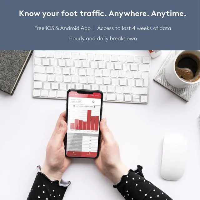 CENTRALIZED DATA: PEARL is the only smart, low-cost door people counter on the market. Fully wireless, it requires no setup fees, uses standard AA batteries, and comes with an exclusive and free cloud-connected iOS & Android app to view the last 4 weeks of hourly & daily foot traffic data. Get even more insights with our optional full-suite analytics web-based software and plans with next-level capabilities and unlimited historical traffic.