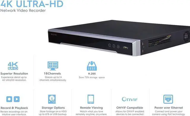 Plug & Play with up to 16 independent PoE network interfaces16-ch network cameras can be connected with 160M incoming bandwidth Up to 2 SATA interfaces