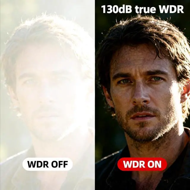 130dB True Wide Dynamic Range (WDR): Guarantees clear and identifiable images even in the most challenging lighting conditions. This technology expertly balances intense backlight and dark shadows, providing precise detail in scenes with bright light sources behind the subject.