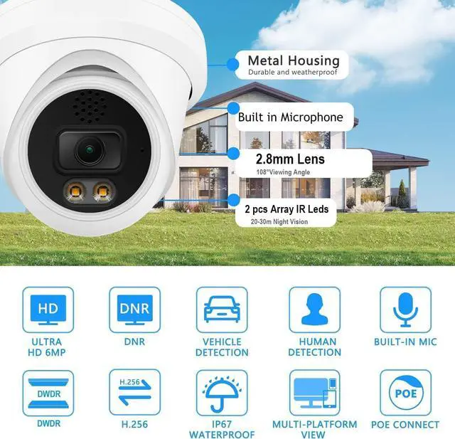 HD 6M Resolution & 24 hours Full-color Night Vision6 Megapixel Super HD dome camera, 1/2.8" Progressive Scan CMOS, Max. 3072x2048 @25fps Super smooth quality, Full time color image even at night, capture more clearer sharper and colorful images and video, 0.01 Lux @ (F1.2, AGC ON).6mp Super HD video recording provides superior quality for reviewing fine details in heightened resolution.