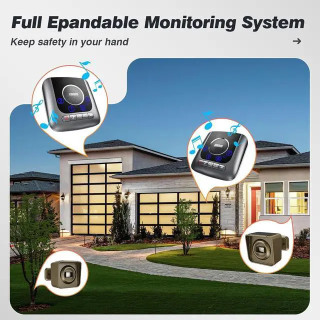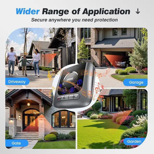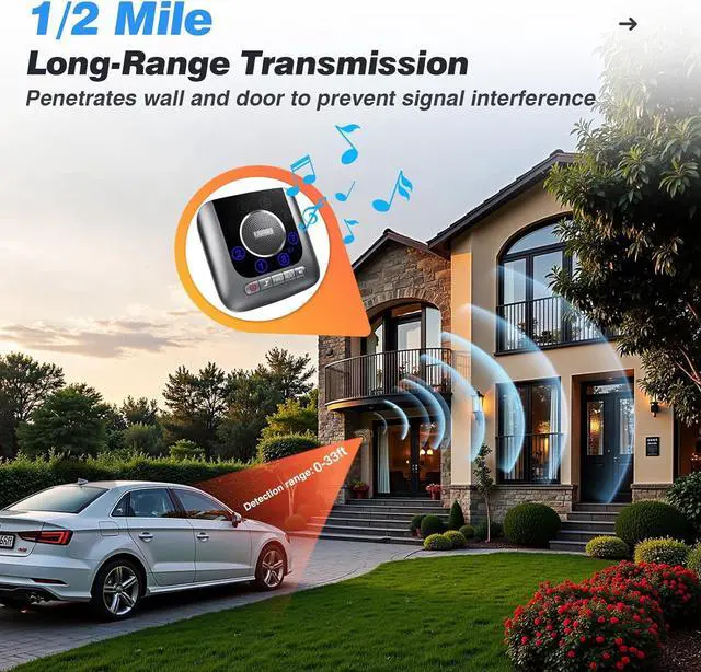3 Sensitivity Levels & Custom Alerts: With 3 adjustable sensitivity levels and up to 33ft detection width, false alarms are minimized. Choose from 12 chimes, 4 volume settings (including mute mode), and LED flash alerts on the receiver for precise, day-or-night notifications.