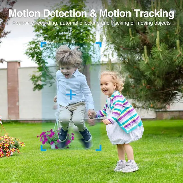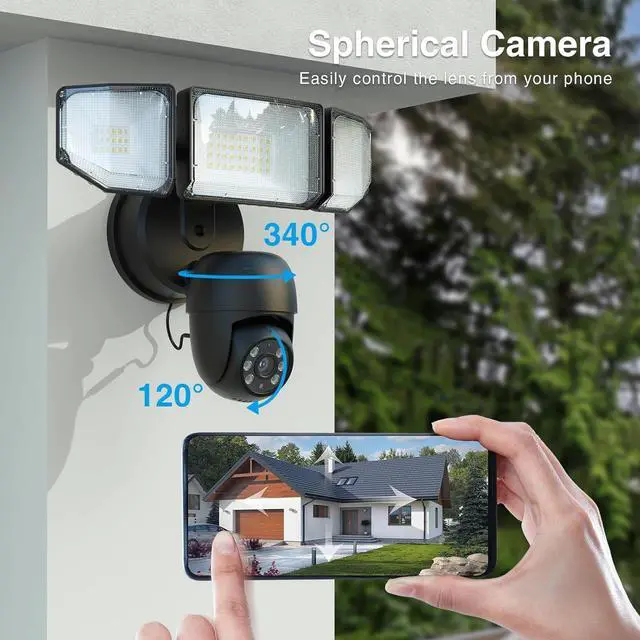 Auto Tracking & Real-time Notifications: Our floodlight security camera has a 340° pan and 120° tilt panoramic view to automatically track moving people, pets, cars in all directions. Once motion is detected, a notification is sent to your phone.