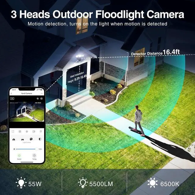 55W Super Brightness & Brightness Adjustable SZPOWER 55W outdoor motion sensor light with camera has 3 adjustable heads and 112 ultra bright LED beads, producing up to 5500lm high brightness. In addition, the brightness can be adjusted directly through the app to meet your needs