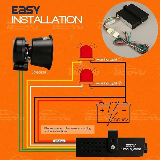 [Upgrade] 9 different siren tones --- This Emergency Warning Horn siren PA system offers the essential function of 9 different siren tones, wail, yelp, horn, horn-1, horn-2, aux. Pre-wired unidirection microphone with PTT (push to talk) button overrides the siren during time of usage.