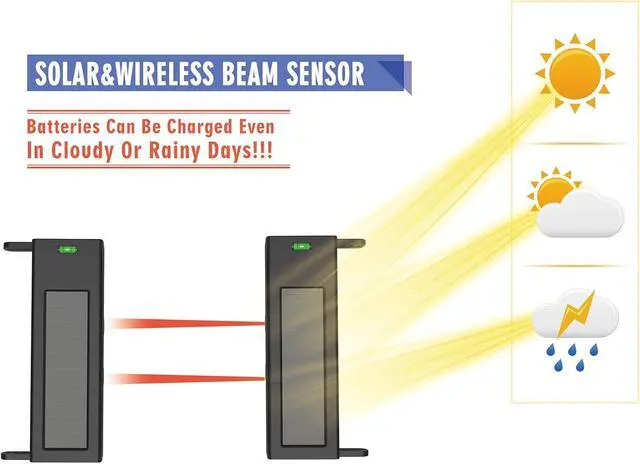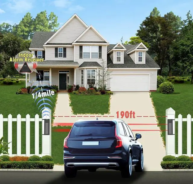 WIDE RANGE OF APPLICATION(Driveway alert,Perimeter alarm and etc)- The infrared detection range of the solar sensors up to 190 feet,that means the infrared sensing terminals can be mounted up to 190 feet apart;and will send a wireless alarm signal back to the wireless alarm receiver up to 1/4 mile away anytime someone passes between the solar sensors(Actual range will vary depending on the local terrain)