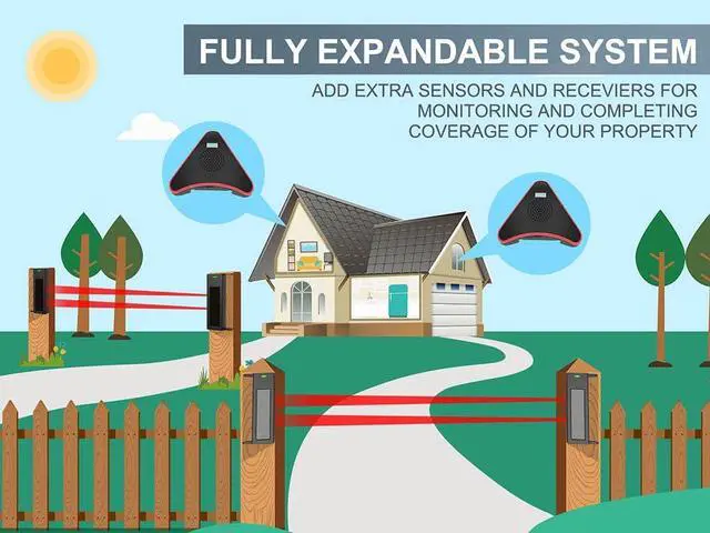 FULLY EXPANDABLE SYSTEM- the kit includes 1 pair solar wireless photoelectric beam sensors and 1 piece AC/Battery powered new version alarm receiver.expandable up to 32 sensors and unlimited alarm receivers for complete coverage of your property. 4 volume levels adjustment and 35 ring tones optional. Match different ring tones with different sensors around your property to differentiate where motion is being detected