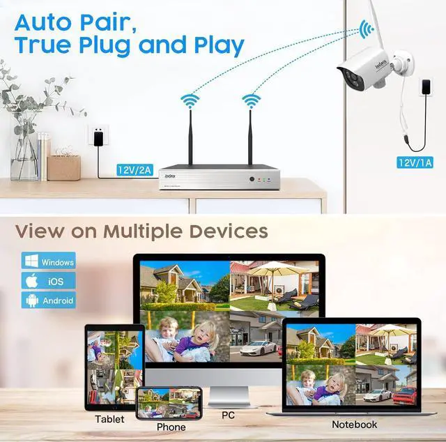 Plug & Play and Easy SetupThe wireless cameras are paired with the NVR system at manufacturing site. Just power on and serve yourself with 24/7 surveillance. Perfect for villa, home, office, shop, warehouse, school, business or elsewhere you wish. (Refer to the manual for further usage)