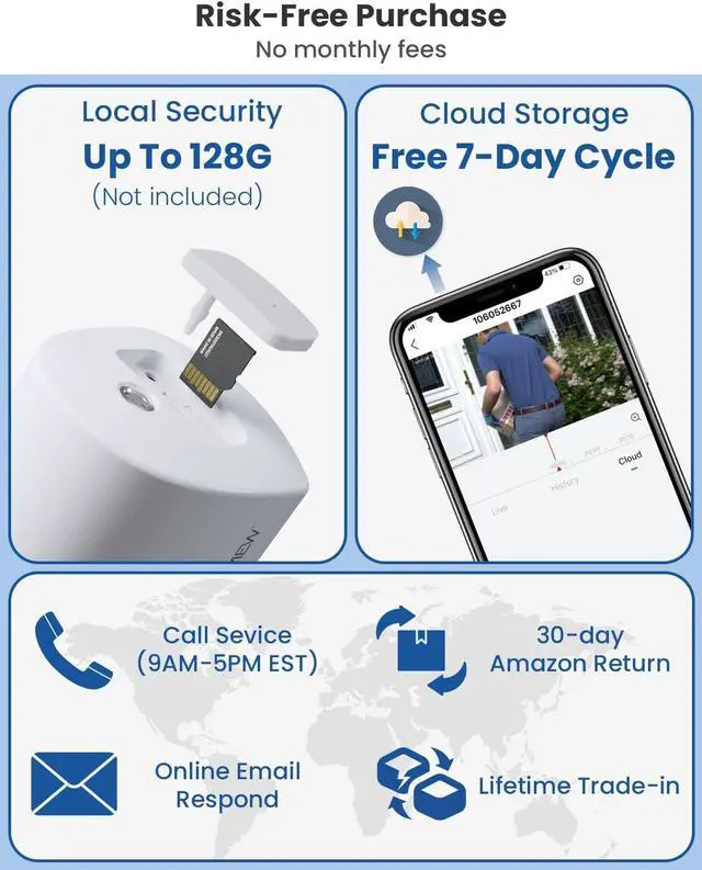 [Enhanced Mubview App & Truly Risk-free Purchase] Live viewing four security cameras wireless outdoor with phone app simultaneously. All your footage is kept private and secure. You can choose to save videos to a Memory card(not included) or the cloud as needed. Mubview ensures you a 36-month pleasant experience and lifetime top customer service. Please feel free to let us know if have any questions about this outdoor security camera.