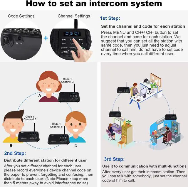 [ Easy to Use with Detailed Manual ] Features include Monitor, Talk, VOX (Voice Operated Exchange), Group, and Calling function. Increase/lower volume, power switch, display screen too! This intercom system is easier to use than others with user-friendly multi-functions and included step-by-step instructions!