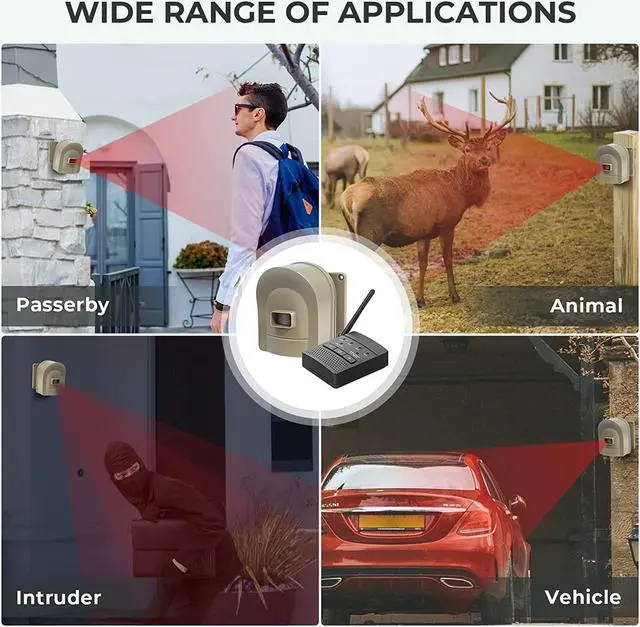 EASY TO INSTALL- Quick Start Guide has you operational in minutes. Can expandable up to 4 sensors and unlimited receivers for complete coverage of your perimeter. wireless driveway alarm Detects movement from humans, cars, and large animals.Over 4 fun & unique chimes to choose from. Match different chimes with different sensors around your property to differentiate where driveway alarm wireless motion is being detected.
