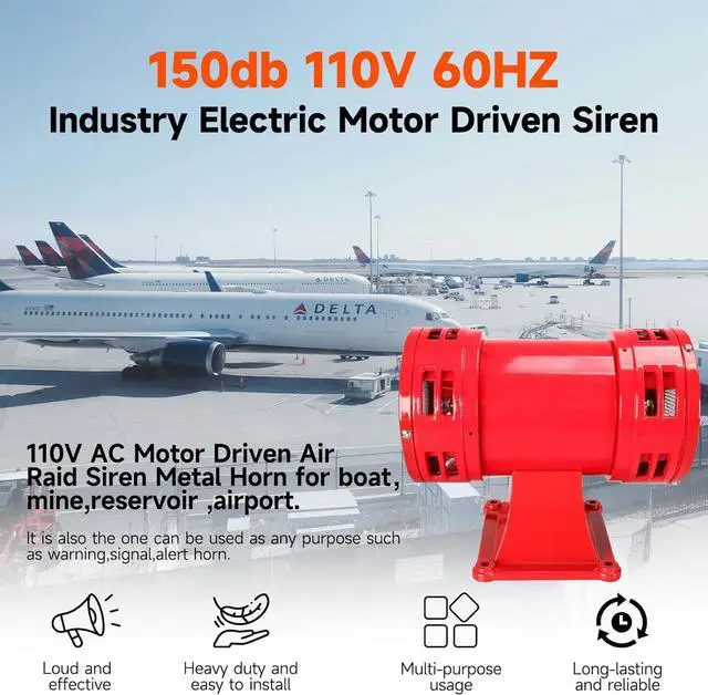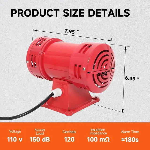 This warning siren produces a loud sound with an effective range of almost a mile in an unobstructed area.High-speed motors can produce a continuous alarm sound, which can extend over a long distance and up to 150db. Make the sound more penetrating.
