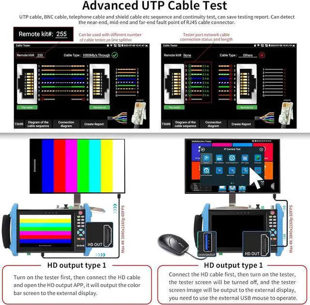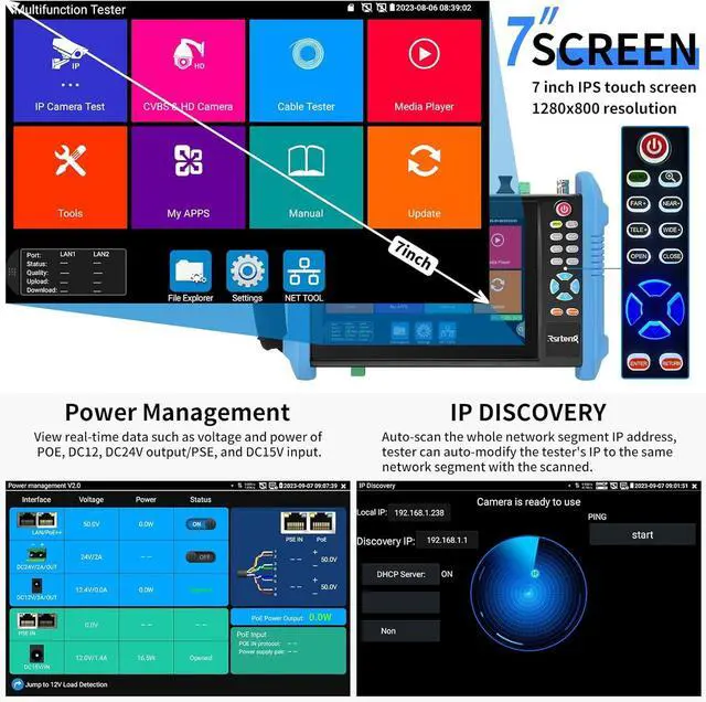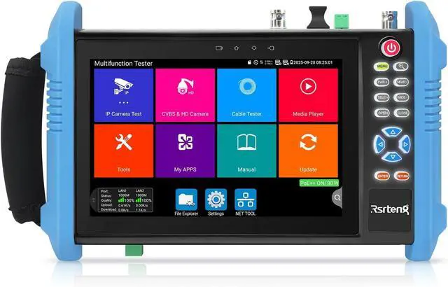 8K IP Camera TesterNetwork camera tester support max 8K 32MP 4K 12MP IP PoE Camera test. Powerful network tools to help you detect and set various network parameters.Support UTP cable test, POE test RJ45 TDR cable test. Its portability, user-friendly design and many other functions make the IPC camera tester an essential tool for all installers.