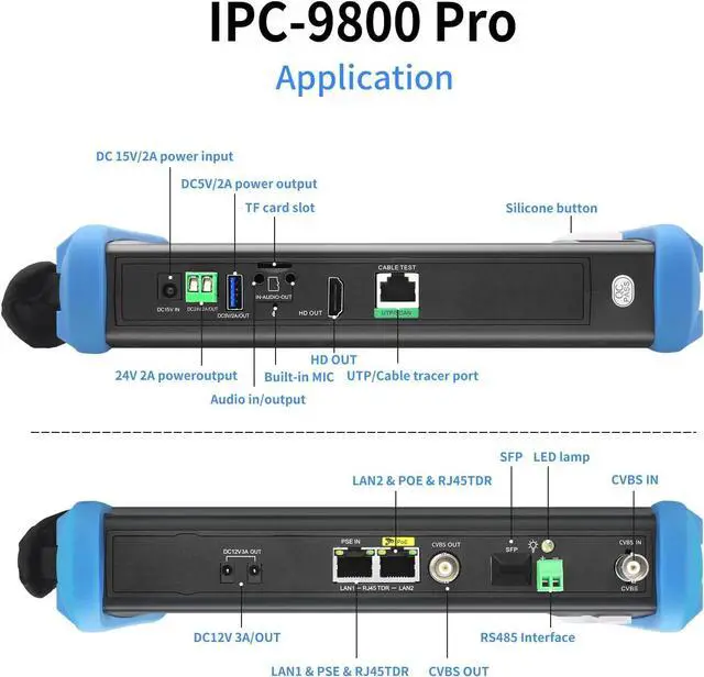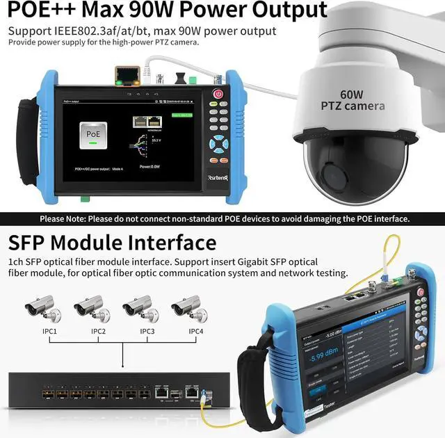 POE++ MAX 90W Power Output & 1CH Gigabit SFP Module InterfaceRsrteng IPC-9800 Pro CCTV Tester support standard IEEE 802.3af&IEEE 802.3at and POE++,max 90W power output.Provide power supply for high-power PTZ speed dome camera. 1CH SFP optical fiber module interface,support insert Gigabit SFP optical fiber module for optical fiber network testing.