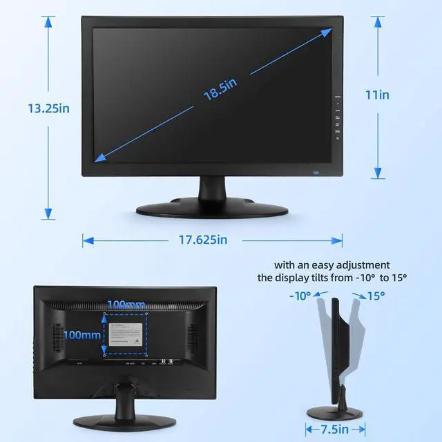 Versatile viewing with BNC input: Our 18.5" CCTV monitor offers flexible viewing options. Connect seamlessly to your PC, DVR, NVR, and gaming console using various ports, including 1x BNC, 1x HDM,1 USB and 1 x VGA. Experience the convenience of versatile inputs and VESA mount capability for an optimal viewing experience.
