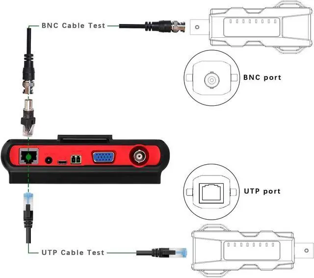 APPLICATION UTP cable test: Test UTP cable connection status and display on the screen(BNC cable&LAN cable).Audio test, Supports 12 languages to choose from ,USB2.0 interface provides 5V / 1A emergency power output,Power the camera with DC 12V /1A power output from the tester.