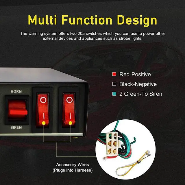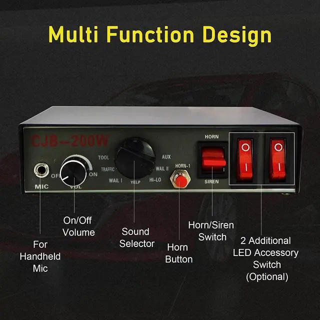 Multifunction:Multiple operation options which include horn and siren , with the siren option giving you yelp, wail, hi-lo and hi-lo and also manual horn & manual siren.