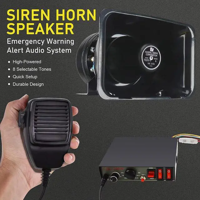 Include:Emergency Warning Horn siren PA system including a control box, a wired hand-held microphone and a heavy-duty speaker. Note:Check your local laws; it may be illegal for this siren to be installed in unauthorized vehicles