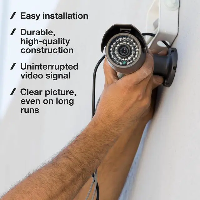 Ideal for CCTV surveillance cameras, composite video, HD, 4K, 5MP DVR, and compatible with BNC connectors.