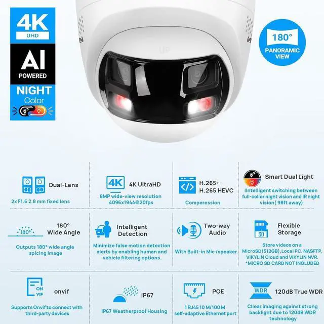Support Human/Vehicle Detection & PoEThe 4k panoramic poe ip camera support alarm triggering by specified target types (human and vehicle), reducing 95% of false alarms caused by other moving objects such as animals, falling leaves, etc. The 8mp dual lens camera allow IP (internet protocol) devices to receive power and data over existing LAN (local area network) cabling. Features an IP67 rating, making it resistant to water and dust, suitable for various indoor and outdoor environments.