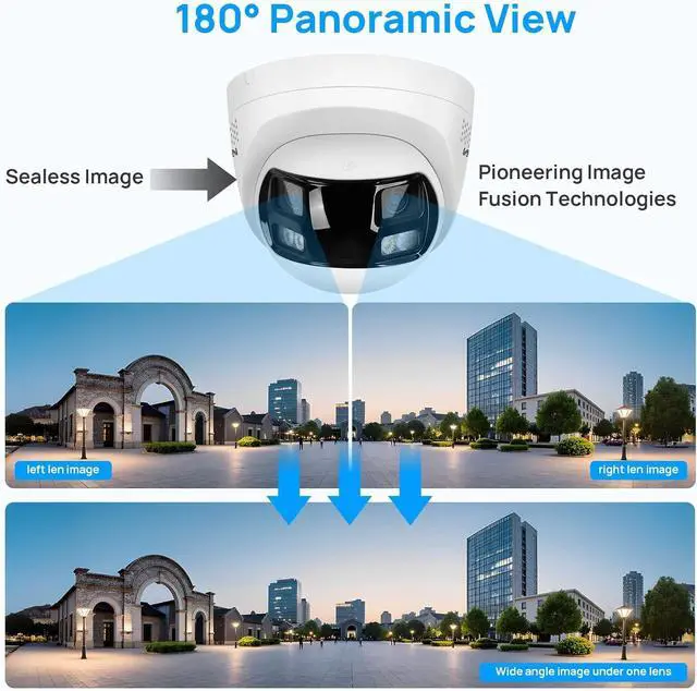 180° Panoramic Ultra Wide AngleThis 8mp dual-lens security camera built-in 2 × 1/2.4 progressive scan CMOS , 2x 2 mm fixed lens and and F1.6 aperture that provides very wide view. So you can see 180 degrees panoramic views ahead of you easily. perfect for surveilling vast outdoor areas. (TipsThis dual-lens camera is suitable for installation or debugging in large outdoor areas, recommended installation height of the camera above 3m. When testing the camera in a small indoor scene, the binocular monitoring screen will produce very obvious cracks, affecting the monitoring effect.)