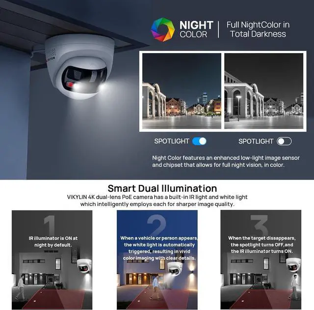 Smart Hybrid Light ModeThis 8mp panoramic camera has taken full color technology, advanced IR & white light fusion ensures full-color imaging at 0.005 lux (0 lux with light),can enhance color imaging in low-light conditions or at night. Smart Dual Light technology adopts smart algorithm to detect targets. Usually, when no human objects are moving, the infrared black and white night vision is maintained. Once an intruder is detected, the camera's lights will automatically turn on to warn potential perpetrators. The max distance up to 98ft. You can also switch to infrared night vision and full color night vision modes to meet your different needs.