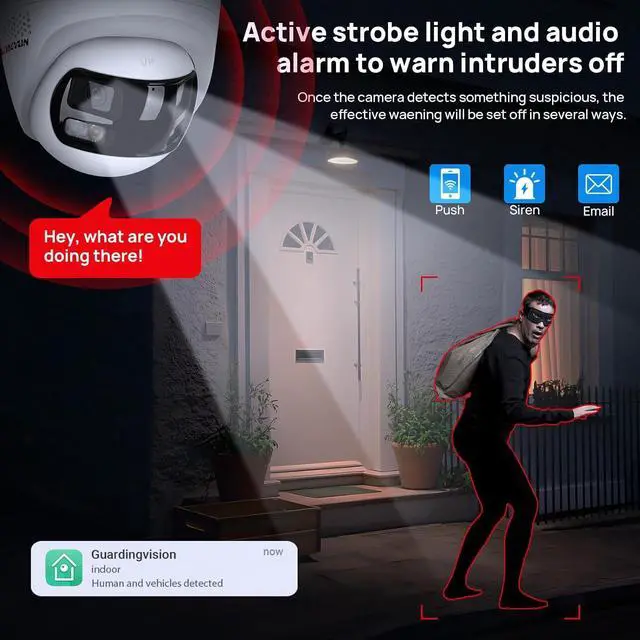 Active Strobe Light & Audio Alarm & Two-Way Audio - This 8mp panoramic security camera built-in speaker & microphone allows you to talk with the people or warn the unfriendly visitors while watching live streaming. It also combines active strobe light and audio alarm to warn intruders off,which deter potential trespassers from entering sites or buildings,preventing property losses and improving safety. Notifications of intrusions and other events can also be sent to you in real time.