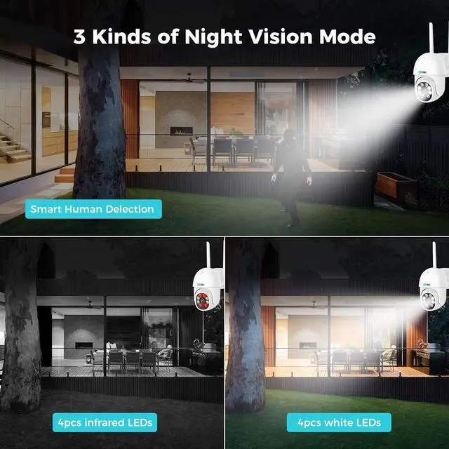 Color Night Vision & 2K HD ImageSovmiku ptz cameras come with 4pcs infrared LEDs and 4pcs white LEDs. Home security cameras provides you with clear and smooth video, color night mode and infrared night mode. With Starlight Sensor, you can see all details within 65 feet even at night.