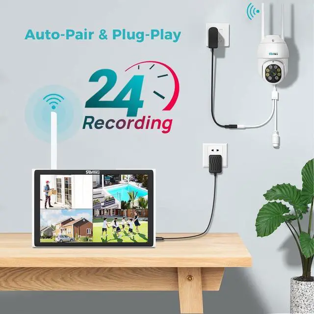 10inch LCD Monitor,Compatible AlexaWifi security camera system features a 10" full HD 2K monitor (Not Touch Screen). The surveillance cameras and NVR monitor are auto-paired during the factory setting. True plug and play. Wireless means camera and NVR is wireless connection, camera and NVR still need work with power cable. You need to download our new app "Tris Home" to use Alexas. Search "Tris Home" in the App store and download. (Tris Home APP can Chat Online and View FAQ)
