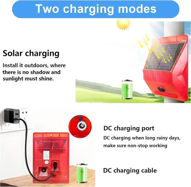 Solar&USB chargingChunHee solar motion sensor security alarm supports both solar and USB charging. It utilizes solar power as the primary source, USB charging as backup when long rainy days, make sure motion alarm outdoor Non-stop work.After fully charged under sunlight, the solar alarm motion detector with sound can work for about 120 days