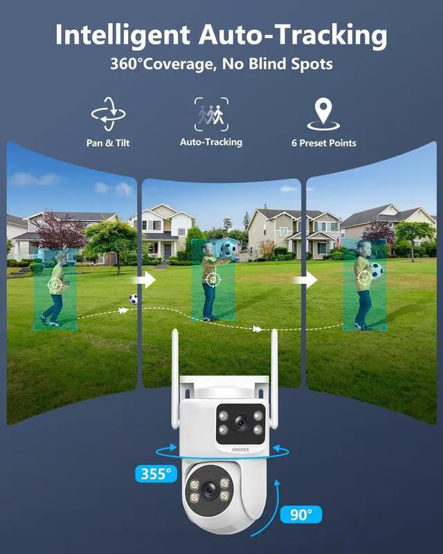 {Dual Lens, Dual Screen & 360° PTZ} Our home camera system combines a fixed panoramic lens for constant monitoring of key areas like your front door or garage, with an active tracking lens that rotates 355° horizontally and 90° vertically. Control the PTZ camera remotely via the