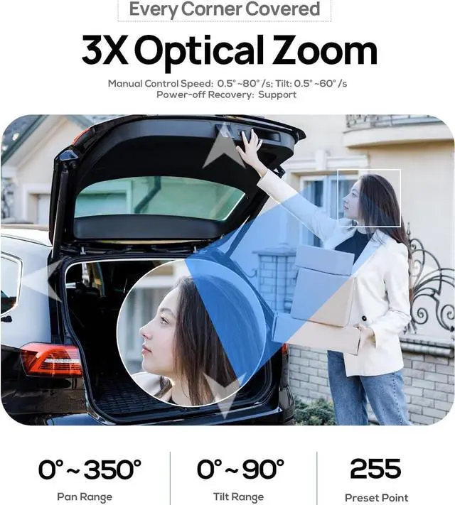 Human/Vehicle Detection & One-way Audio- This 6mp ptz camera outdoor is advanced person/vehicle detection based on cutting-edge detection algorithms helps identify real threats, and when an alarm occurs, the camera captures it in time and sends an alarm message to your phone,the accuracy rate is up to 99%. 6mp ptz poe camera built-in mic audio recording (one-way audio), real-time capture of the sound around the camera,don't miss any details.For superior around-the-clock surveillance, you can count on the cameras 120dB true Wide Dynamic Range (WDR) that gains better images in diverse lighting conditions.