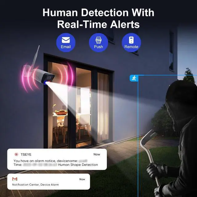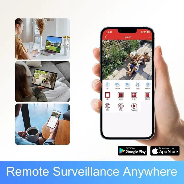 Two-way Audio and Remote access: Our wireless camera system is equipped with a highly sensitive microphone and a powerful speaker, enabling two-way audio communication. The outdoor security camera system enables you to remotely view real-time videos anytime and anywhere via your mobile phone and tablet, such as when traveling abroad. We offer free mobile apps (iOS and Android) and PC clients, which can be downloaded from the "Google Play Store" or the "APP Store".