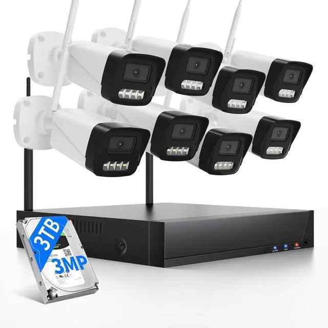 Cost-effective Wireless Home Security System: The Day & Night Vision Surveillance NVR kit comprises of eight 3MP HD wifi cameras, each equipped with IP66 waterproof rating, ensuring reliable performance in all weather conditions. The NVR is also pre-loaded with a 3TB hard drive, offering advanced features like long-range night vision (up to 100 feet), live streaming, remote monitoring, and instant motion detection alerts.