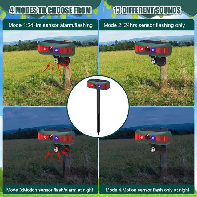 4 Modes Function: our solar alarm system has 4 working modes to choose from Mode 1 for 24 hours sound alarm and red and blue flashing mode 2 for 24 hours motion sensor only red and blue flashing but no alarm Mode 3 for motion sensor night sensing, there are 13 sound alarms, 4 red and blue flashing modes at night, and 4 red and blue flashing modes only at night, you can set it according to your needs