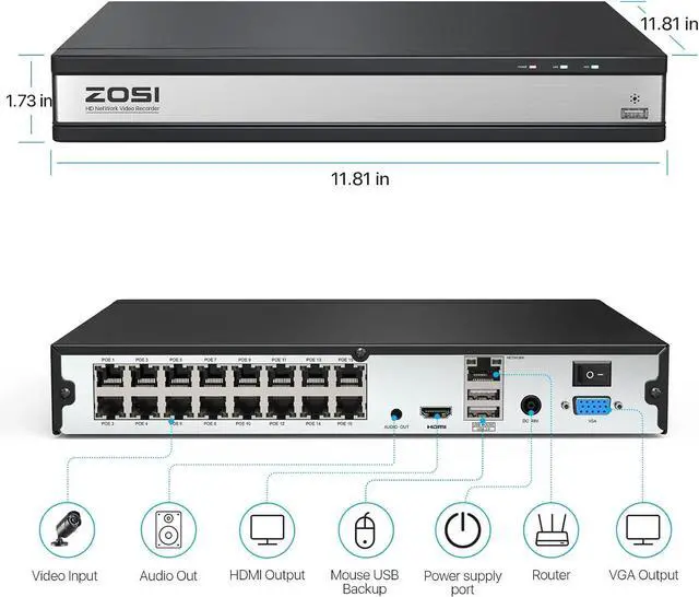 Expandable 32CH System with PoE switch- The ZOSI 4K 16CH PoE NVR can be expanded to support up to 32 PoE cameras by adding a 16CH PoE switch (not included). This flexibility allows you to enhance your surveillance system by integrating additional ZOSI PoE cameras as needed.