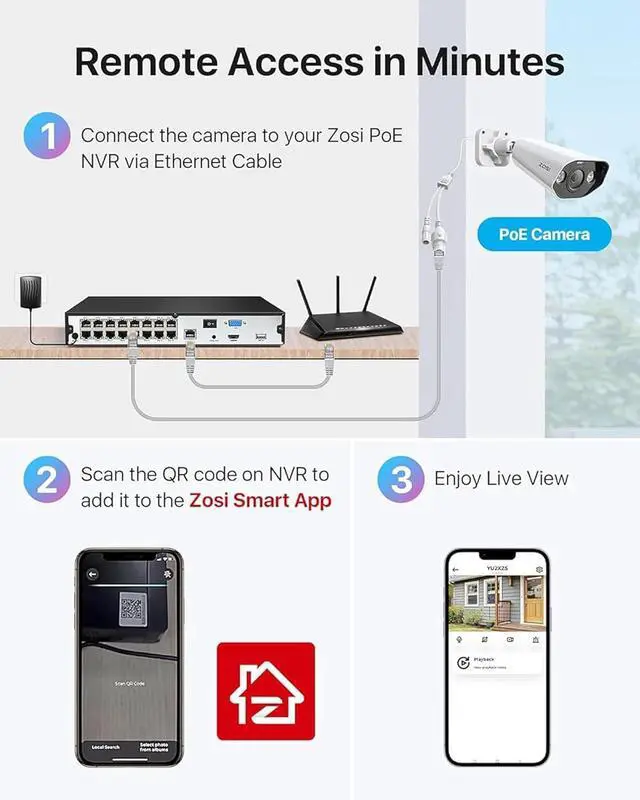 Remote Access and Control via ZOSI Smart App-Stay connected to your property anytime, anywhere with the ZOSI Smart app. Live view, playback footage, and configure detection zones to minimize false alarms, all from your smartphone or tablet.
