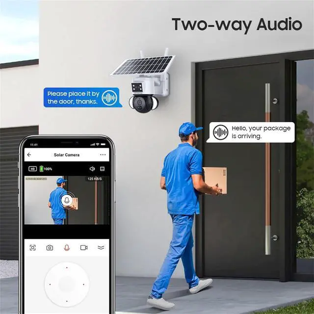 PIR Motion Detection & Two-way Audio - solar powered security camera designed with built in radar PIR motion sensor, dual control make the sensitivity higher. When the movement detected,records real-time videos and sends alerts to your TUYA SMART LIFE app instantly,After receiving the alert, you can speak to the person in front of the camera in real-time through the APP.