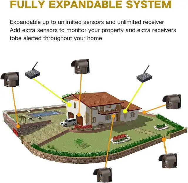 EASY TO INSTALL- Quick Start Guide has you operational in minutes. Can expandable up to 4 sensors and unlimited receivers for complete coverage of your perimeter. wireless driveway alarm Detects movement from humans, cars, and large animals.Over 4 fun & unique chimes to choose from. Match different chimes with different sensors around your property to differentiate where driveway alarm wireless motion is being detected.